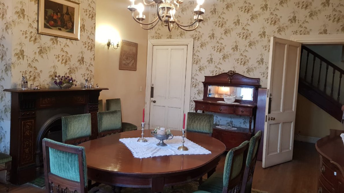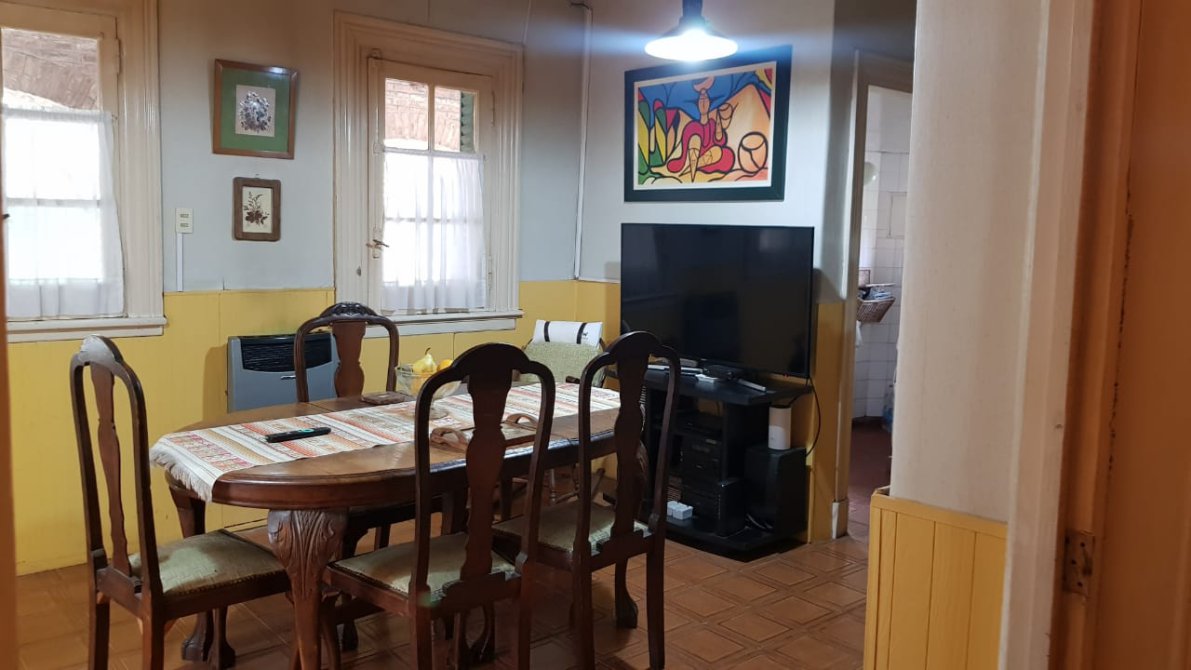 Living y comedor principal con pisos de pinotea y vistas al jardín.
