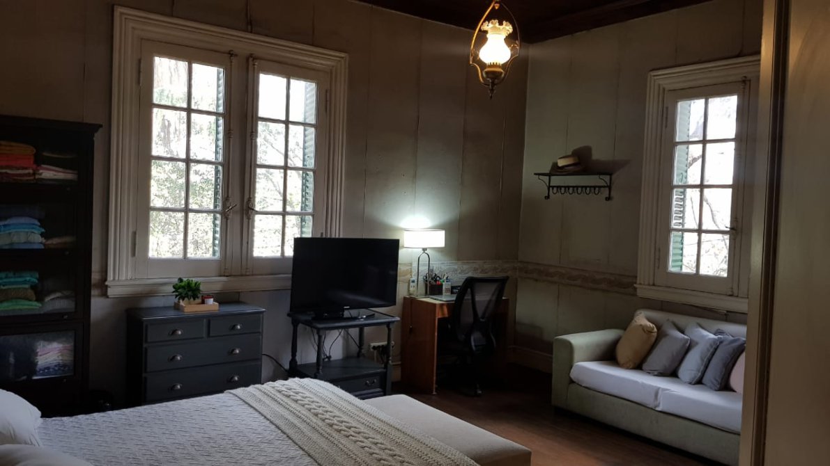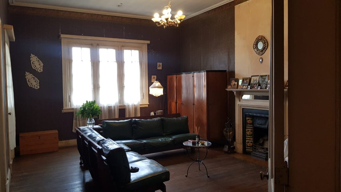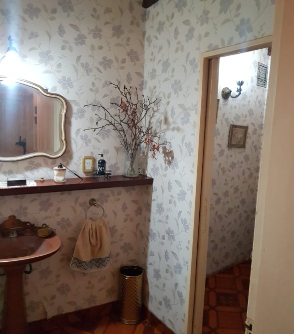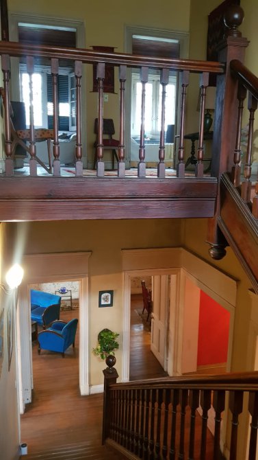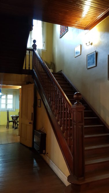 Se accede desde el porch principal a un amplio hall de distribución con escalera de madera a la planta alta.
