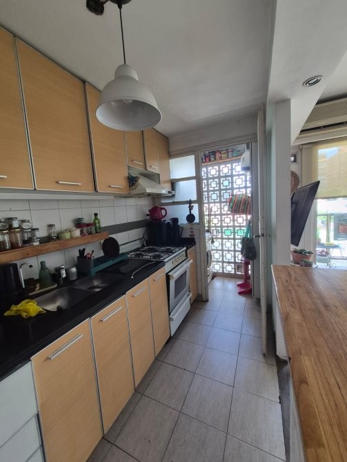 Cocina con muebles bajo y sobre mesada con barra desayunadora al living comedor.