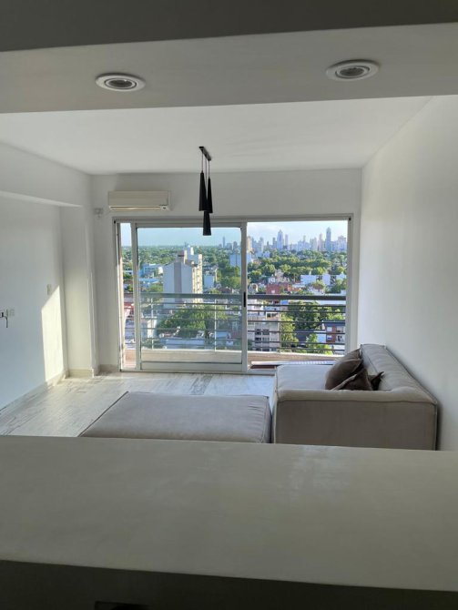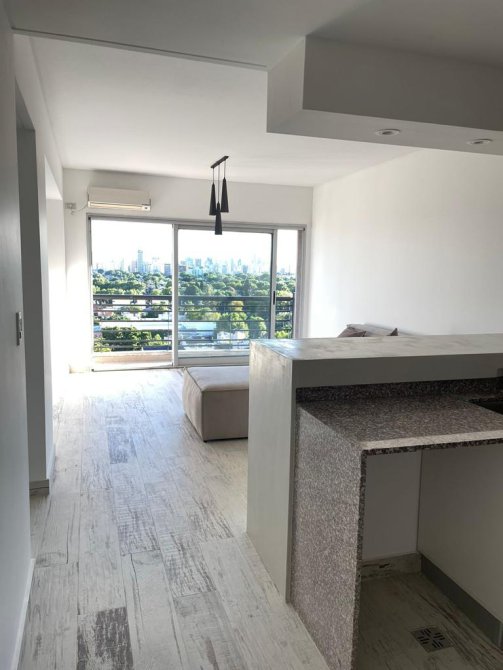 Living comedor muy luminoso y amplio, con excelentes vistas y balcón corrido. Piso porcelanato simil madera. Aire acondicionado frío calor. Medidas 3,50 x 4.80m
