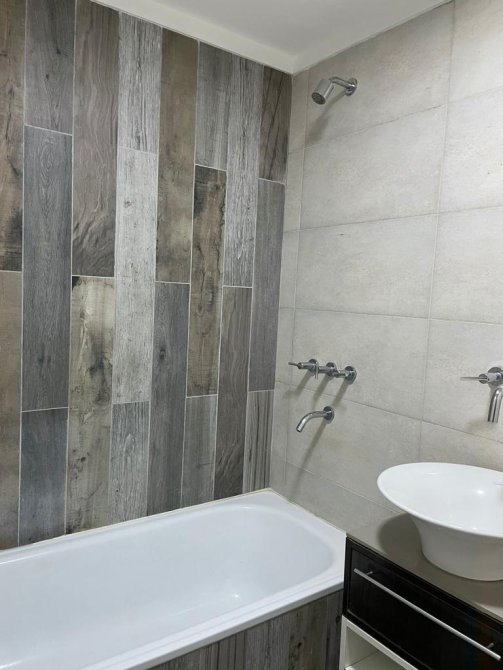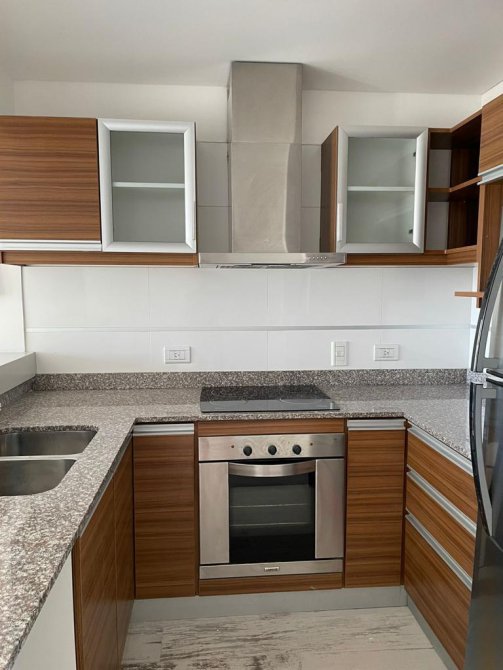 Cómoda cocina incorporada al comedor por barra pasaplatos de cemento alisado. Muebles bajo y sobremesada con terminaciones en aluminio. Mesada de granito con doble bacha de acero. Anafe vitrocerámico. Horno eléctrico y campana en acero.