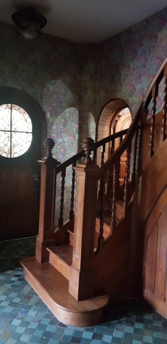 Hall de recepción con escalera de madera.