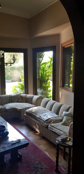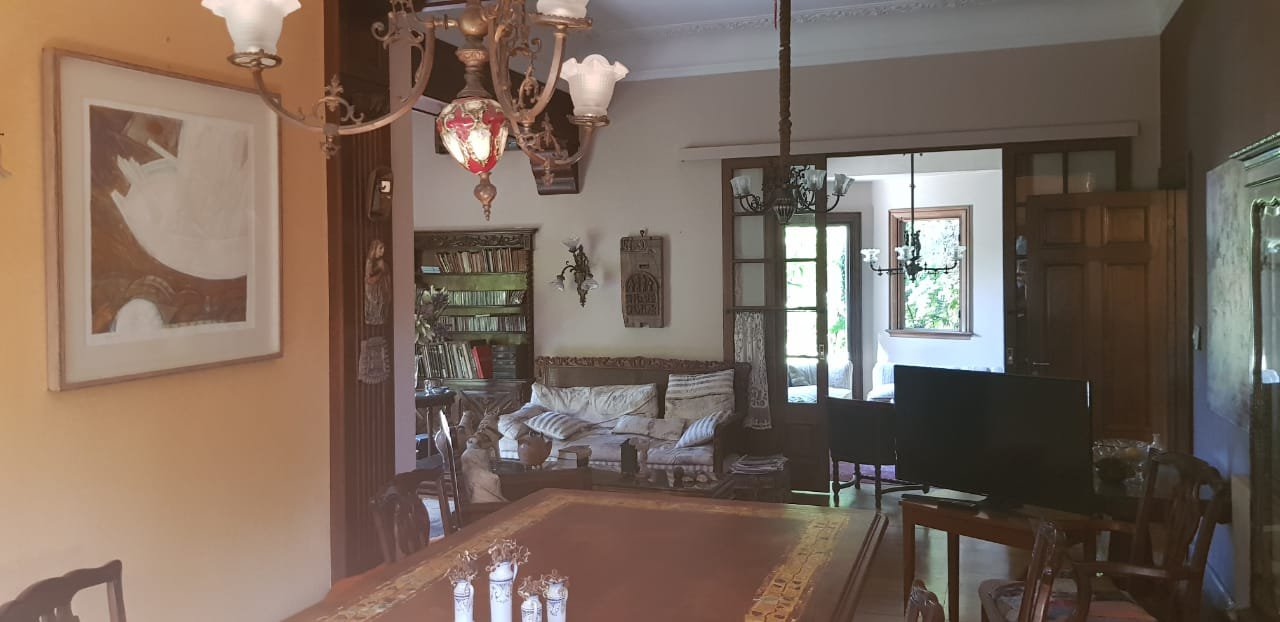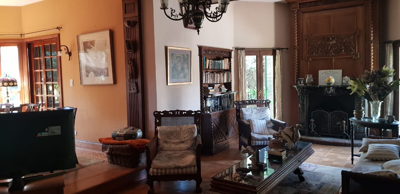 Living de recepción, living prinicpal con hogar a leña y comedor principal con excelentes vistas al jardín. Pisos de madera.