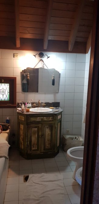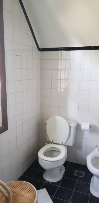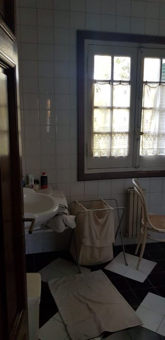 Baño completo con bañera al frente de amplias dimensiones. Piso damero.