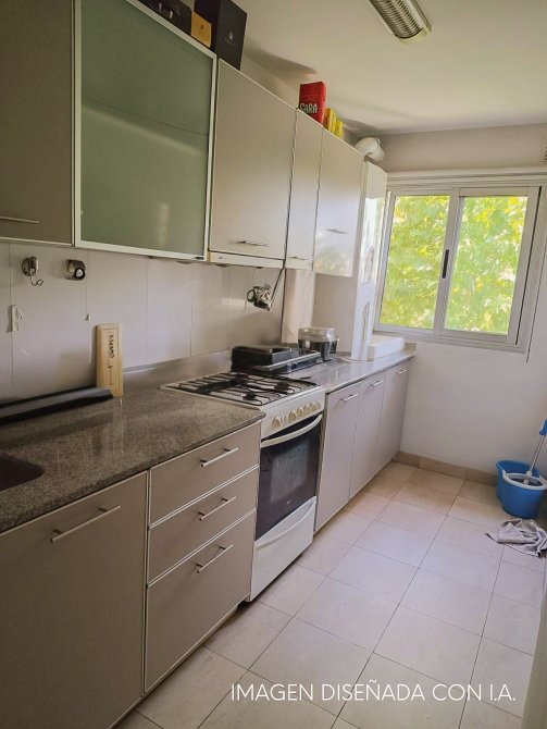 Lavedero incorporado en la cocina con mesada, bacha y muebles bajo y sobre mesada.