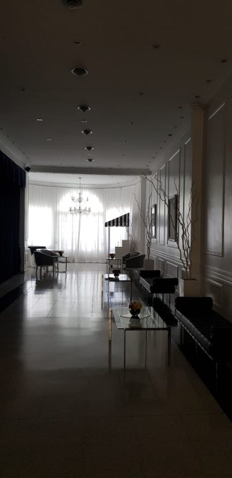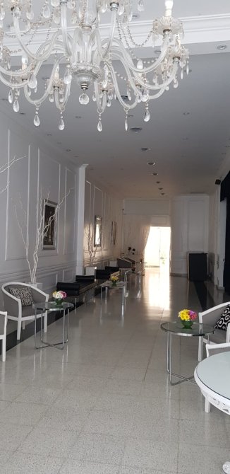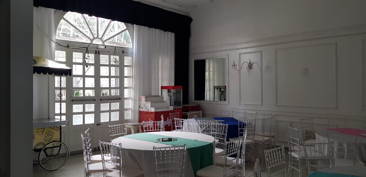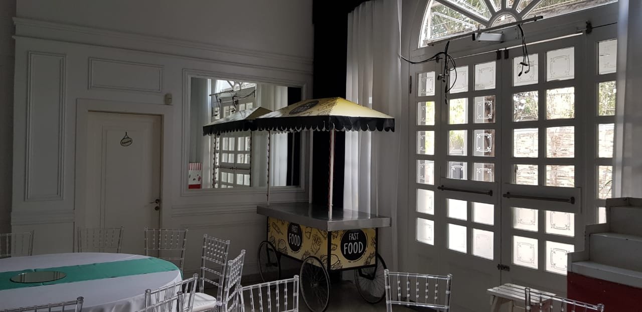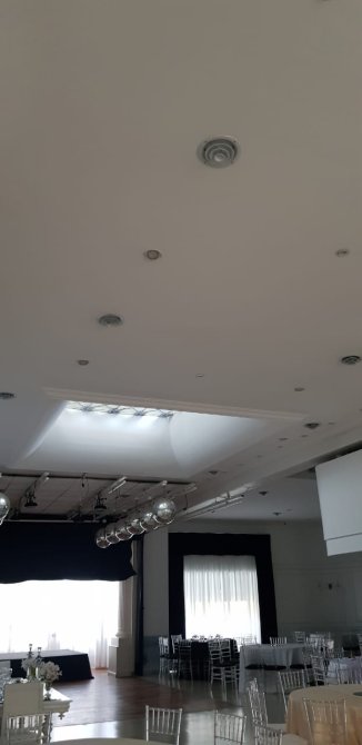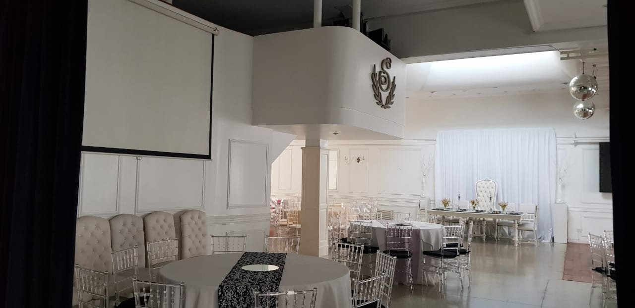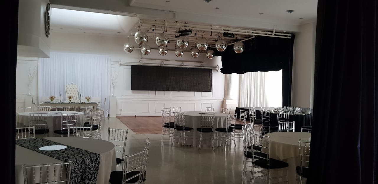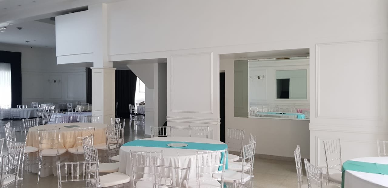 Amplia Recepción y amplio salón con capacidad para 160/180 personas. Posee calefacción y aire acondicionado central. Excelentes materiales y terminaciones. Piso de cerámico granítico. El sector de pista de baile posee piso de madera tarugada y techo de vitro. Aberturas en madera con vidrio repartido. Detalles de categoría. Todos los cielos rasos y paredes con detalle de molduras. Luminaria completa.