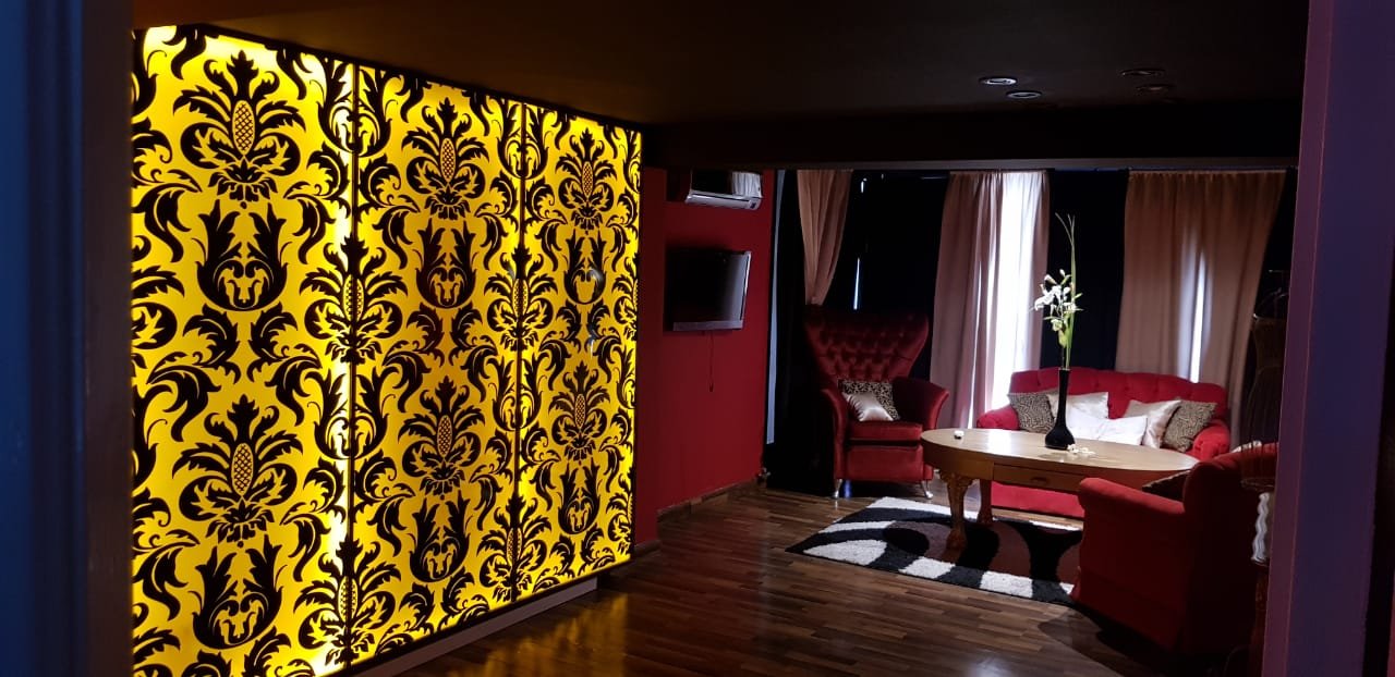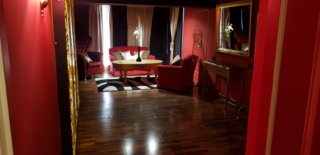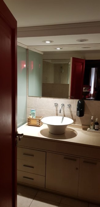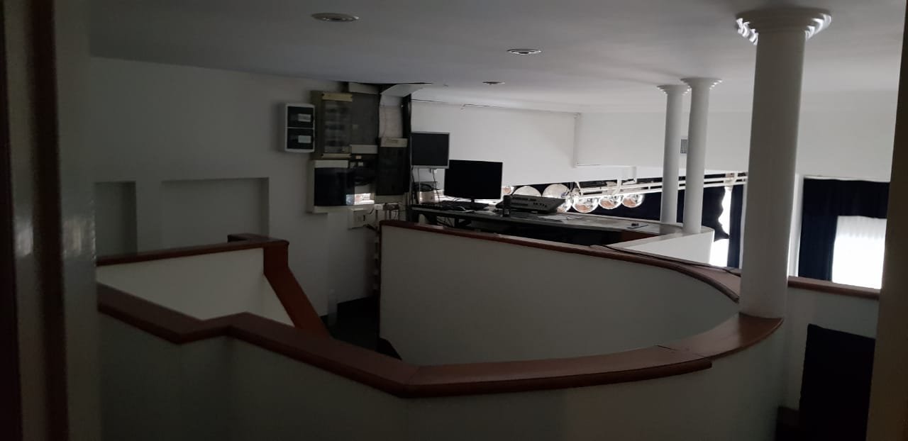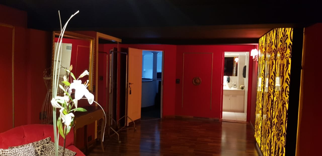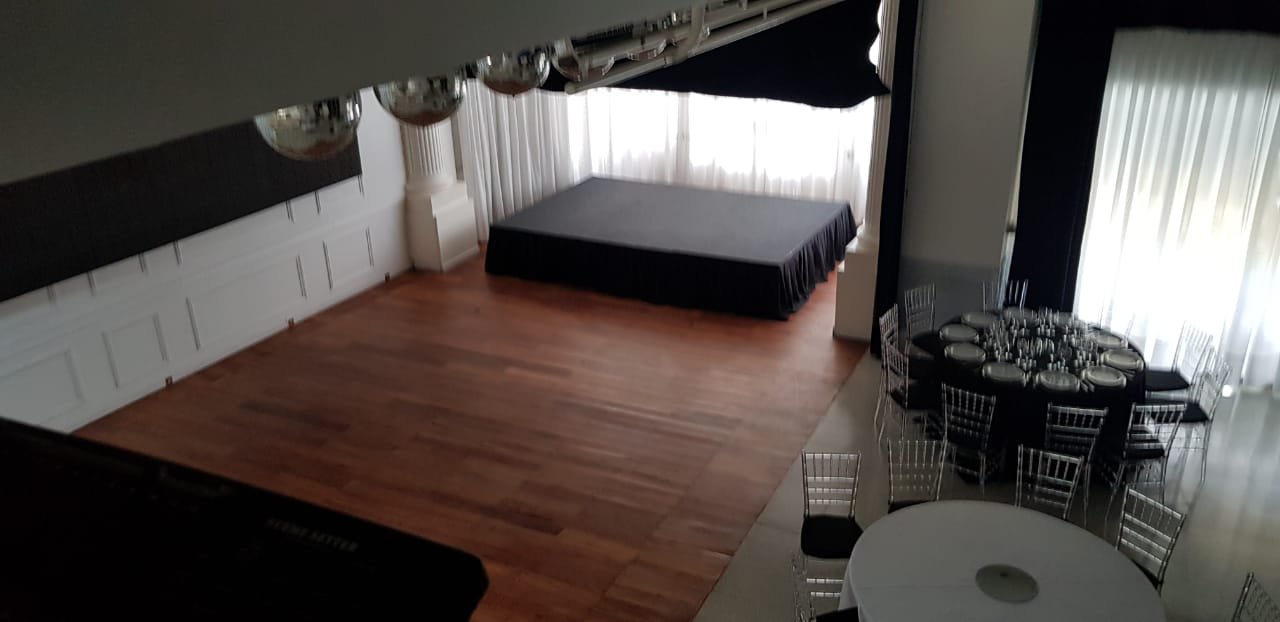 Escalera alfombrada, box para DJ alfombrado, como así también el pasillo que distribuye a oficina y a la suite. La suite posee, amplio ambiente con piso de madera tarugado, aire acondicionado, Tv, baño completo con box de ducha, salida por puerta ventana a balcón con escalera de acceso al patio donde se desarrollan las recepciones de los eventos.