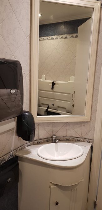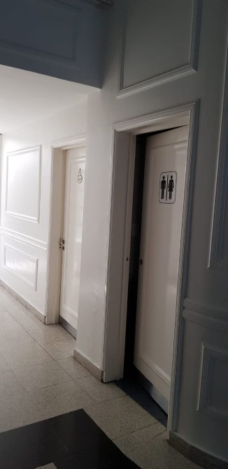 Baño para discapacitados. Baño de mujeres con doble bacha en mesada y tres cubículos. Baño de hombres con doble bacha en mesada, dos cubículos y dos mingitorios. Guardarropa. Espacio de montacarga.