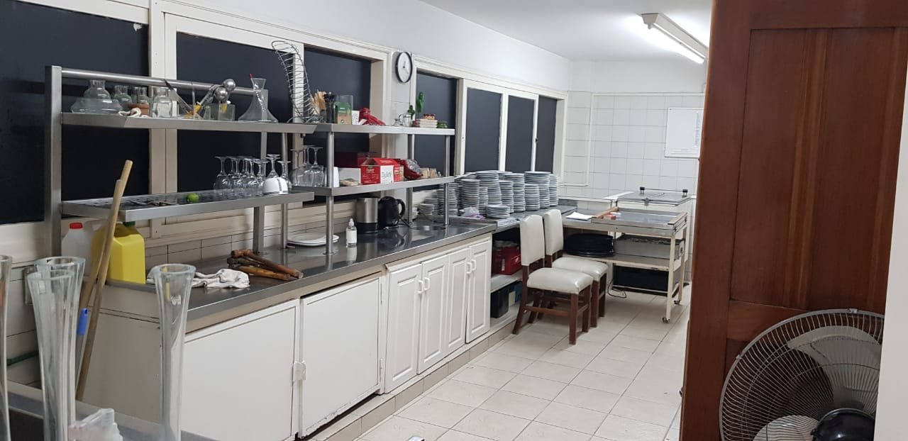 Amplia cocina de doble circulación con otra cocina en subsuelo. Mesada, bachas y estanterías de acero inoxidable, muebles bajo mesada. Escalera a subsuelo. El mismo cuenta con cámara frigorífica, sector de freezers, depósito, baño, lavadero y mesada con bacha de acero inoxidable.