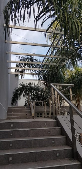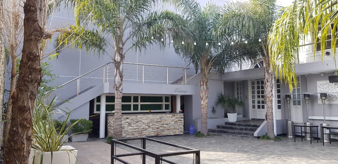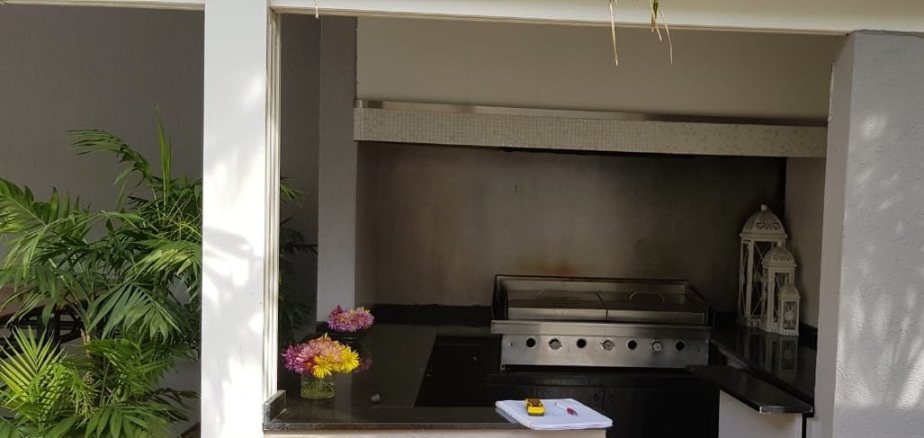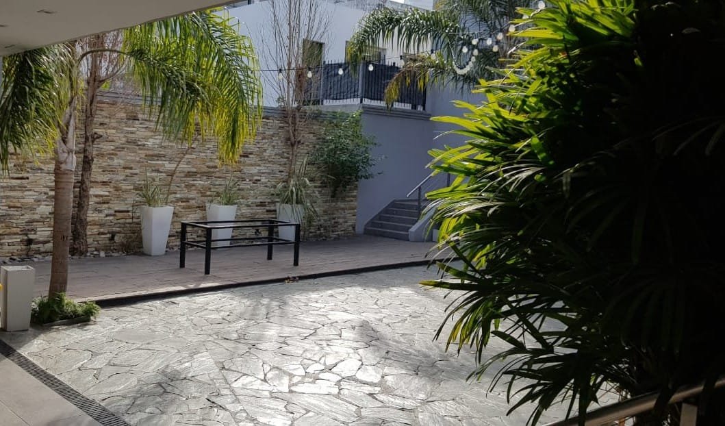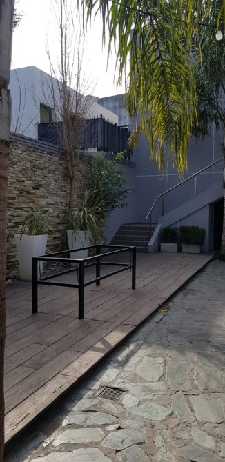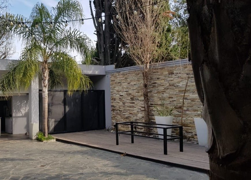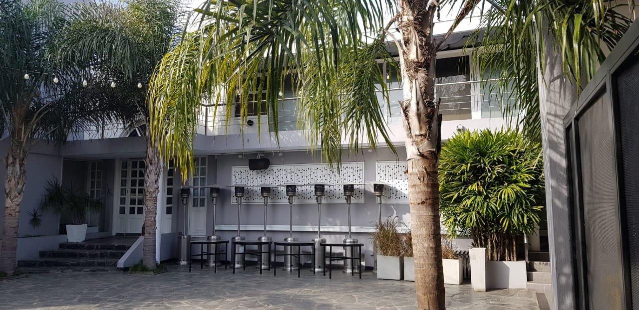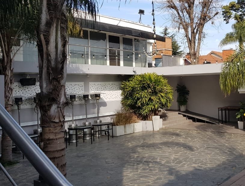 Amplio patio para recepción, medidas 18 m de ancho por 13 m de profundidad. Parrilla semicubierta con mesada en forma de U, bacha de acero y mueble bajo mesada. Baño con ducha. Guarda enseres con grupo electrógeno. Barra semicubierta con mesada de mármol, dos depósitos uno amplio y el otro bajo escalera. Escalera de acceso a balcón y planta alta.