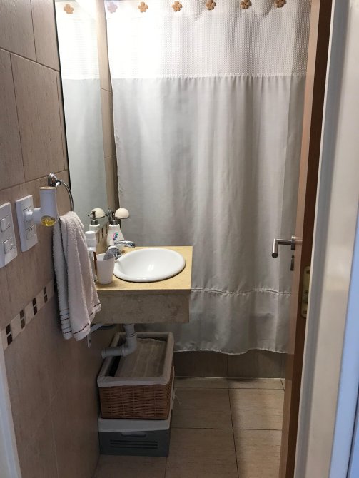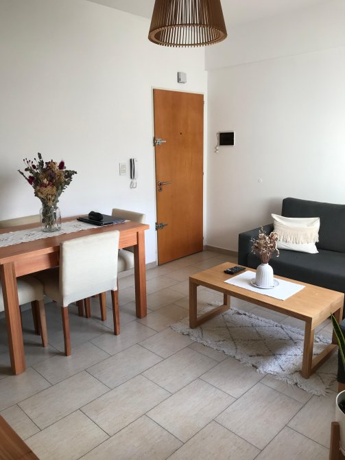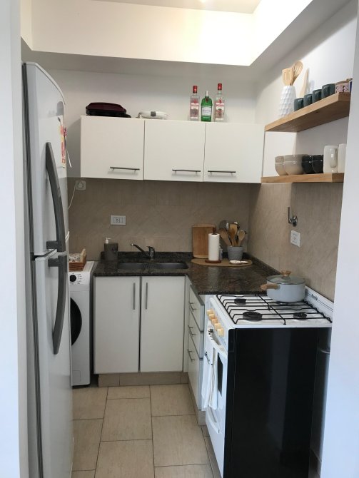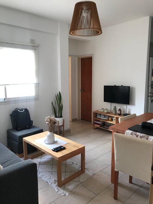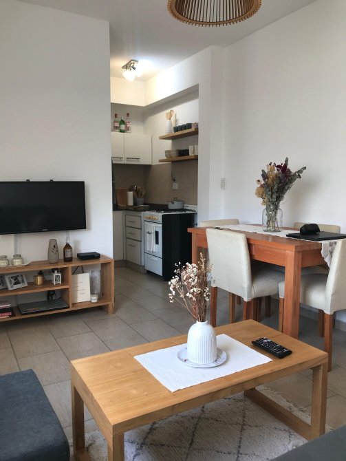 Living comedor y cocina semi incorporada con muebles bajo y sobremesada. Conexión para lavarropas.